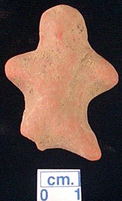 | Description / विवरण | An archaic human terracotta figurine with round head, red, mutilated face, short out stretched arms, shrot wide bridged stumpy legs but right one is broken, handmade. |