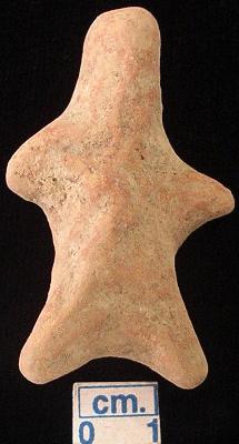 | Description / विवरण | A terracotta archaic human figurine, red in colour, pin hole eyes, pinched nose, short arms, short wide bridged stumpy legs but the right one is damaged, treated with red wash, handmade. |