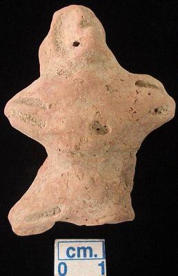 | Description / विवरण | A terracotta archaic human figurine, red in colour, pin hole eyes, pinched nose, slit mouth, short out streached arms with two incised line in each, short wide bridged stumpy legs with two incised line in each, treated with red wash, punched navel, handmade. |