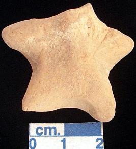 | Description / विवरण | A star shaped terracotta archaic human figurine with broken head, dull red, short out stretched uneven arms, short wide bridged stumpy legs, treated with red wash, handmade. |