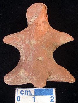 | Description / विवरण | A star shape terracotta archaic male figurine with round head, red colour, pin hole eyes, pinched nose, slit mouth, short out stretched arms, punched navel, short wide bridged stumpy legs, phallus indicated, treated with red wash, handmade. |