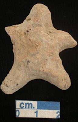| Description / विवरण | A star shaped archaic terracotta human figurine with round head, punched hole eyes, pinched nose, slit open mouth, short out stretched stumpy arms, short wide bridged stumpy legs, treated with red wash. |