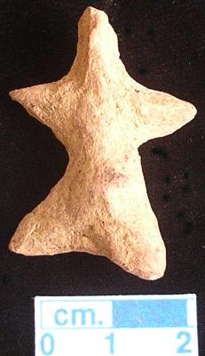 | Description / विवरण | A tiny terracotta archaic human figurine with elongated head, dull red, pinched nose, short out stretched pointed arms, short bridged stumpy legs, devoid of any surface treatment, handmade. |