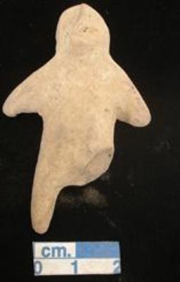 | Description / विवरण | An archaic terracotta human figurine with round head, pin hole eyes, pinched nose, slit open mouth and chin, short out stretched stumpy arms, short wide briged stumpy legs, treated with red wash. |