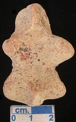 | Description / विवरण | A terracotta archaic male figurine with round head, red colour, pin hole eyes, pinched nose, slit mouth, short out stretched arms, short wide bridged stumpy legs, pinched phallus, treated with red wash, handmade. |
