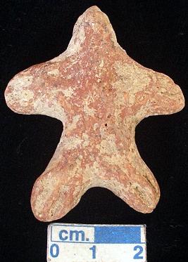 | Description / विवरण | A star shaped terracotta archaic human figurine with small head, red colour, punched eyes, pinched nose, short out stretched arms with two incised lines on each, short wide bridged stumpy legs with two incised lines on each, treated with red wash, handmade. |