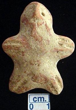 | Description / विवरण | A terracotta archaic human figurine with round head, red colour, pin hole eyes, pinched nose, slit mouth, short out stretched arms with two incised line in each, short wide bridged stumpy legs with two incised line in each, treated with red wash, handmade. |