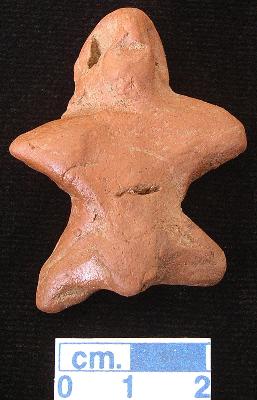 | Description / विवरण | An archaic male terracotta figurine, red, pinched nose, slit open mouth, short out stretched arms and legs, phallus indicated, handmade. |