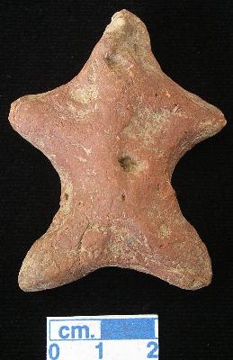 | Description / विवरण | An archaic human terracotta figurine with broken face, red, punched eyes, pinched nose, open mouth, short out wide stretched arms, punched navel, short wide bridged stumpy legs, treated with red wash, handmade. |