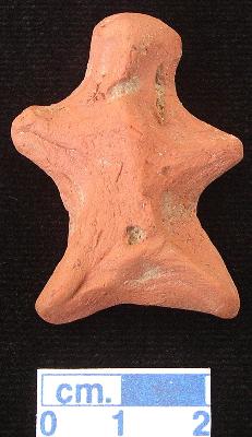 | Description / विवरण | A tiny archaic human terracotta figurine with round head tilted towards left, red, punched eyes, pinched nose and mouth, short out wide stretched arms, punched navel, short legs, treated with red wash, handmade. |