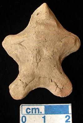 | Description / विवरण | A star shape terracotta human figurine with small head, dul red, pinched nose, punched eyes, open slit mouth, short out stretched arms, punched navel, short wide bridged stumpy legs, blackish due to over firing, handmade. |