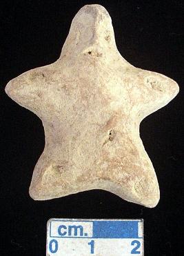 | Description / विवरण | A star shaped terracotta archaic human figurine with round head, dull red colour, pin hole eyes, pinched nose, slit open mouth, short wide out stretched arms with one inciesd lines on each,pin hole navel, short wide bridged stumpy legs with one incised lines on each, devoid of any surface treatment, handmade. |