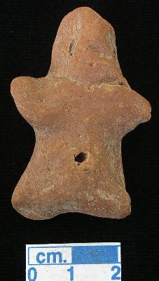 | Description / विवरण | A terracotta archaic human figurine, dull red colour, punched eyes, pinched nose and mutilated mouth, very short out stretched arms, punched navel, short wide uneven legs, treated with red wash, handmade. |