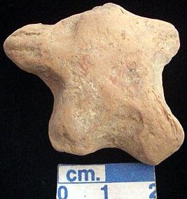 | Description / विवरण | An archaic terracotta human figurine with broken head, red, short out stretched arms with two incised lines on each, short bridged stumpy legs but the right one is partly broken, traces of red slip, handmade. |