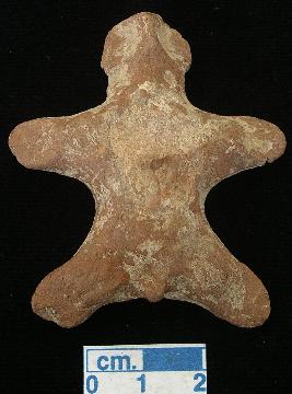 | Description / विवरण | A star shaped terracotta archaic male figurine with small head, dull red colour, pinched nose, short out stretched stumpy arms, short wide bridged stumpy legs, phallus indicated, treated with red wash, handmade. |