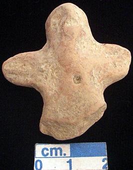 | Description / विवरण | A fragment of terracotta archaic human figurine, dull red, pinched nose, slit mouth, short out stretched arms with two incised line on each, pin hole navel, traces of red wash, handmade. |