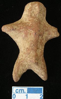 | Description / विवरण | A terracotta archaic male figurine with flat on top head, dull red colour, pinched nose and mutilated face, short out stretched stumpy arms but left one is partly broken, short wide bridged stumpy uneven legs, phallus indicated, traces of red wash, handmade. |