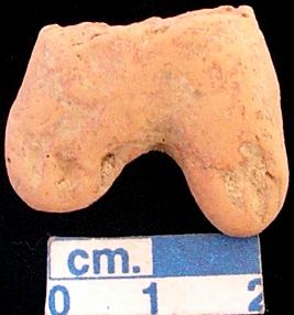 | Description / विवरण | A fragment of terracotta archaic human figurine, red, short wide bridged stumpy legs with three incised line on each, traces of red slip, handmade. |