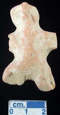 | Description / विवरण | An archaic human terracotta figurine with round head, red, pinched nose, pin hole eyes, slit mouth, short out stretched arms and incised lines in right arm, pin hole navel, shrot wide bridged stumpy legs with incised lines in each, treated with red wash, handmade. |