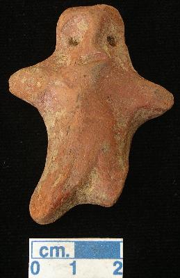 | Description / विवरण | An archaic human terracotta figurine with round head , red, pinched nose, punched eyes, split mouth, short out stretched arms, short out bridged stumpy leg left leg is broken , handmade. |