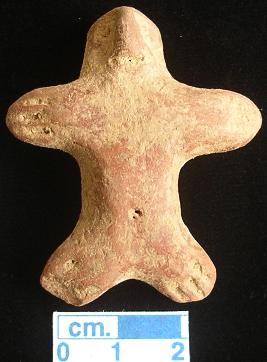 | Description / विवरण | A terracotta archaic human figurine with round head, red, pin hole eyes, pinched nose, open slit mouth, short out stretched arms with three incised lines in each,pin hole navel, short bridged stumpy legs with three incised lines in each, treated with red slip, handmade. |