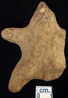 | Description / विवरण | A terracotta archaic human figurine with small head, red colour, pin hole eyes, pinched nose, slit mouth, short out streached arms but the left one is broken, short wide bridged stumpy legs but the left one is damaged, treated with red wash, handmade. |