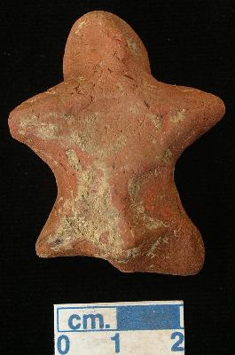 | Description / विवरण | A star shaped terracotta archaic human figurine with round head, pinched nose and mouth, short out stretched stumpy arms, both legs joint with each other and treated with red wash. |