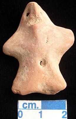 | Description / विवरण | A terracotta archaic human figurine, red, pin hole eyes, pinched nose, slit open mouth, short wide out stretched arms, punched navel, short wide legs, treated with red wash, handmade. |