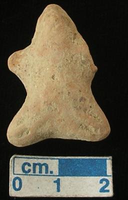 | Description / विवरण | A tiny terracotta archaic human figurine, red, pin hole eyes, pinched nose, short out stretched arms but the left one is broken, short bridged stumpy legs with two incised lines in each, treated with red wash, handmade. |