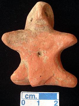 | Description / विवरण | A terracotta archaic male figurine with round head, red colour, pin hole eyes, pinched nose, slit open mouth, short out stretched arms, pin hole navel, short wide uneven legs, phallus indicated, treated with red wash, handmade. |