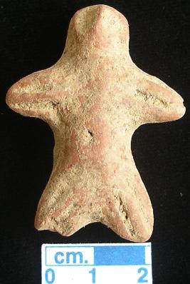 | Description / विवरण | A terracotta archaic human figurine with small head, red colour, pinched nose, short out stretched arms with two incised lines in each, pin hole navel, short wide bridged legs with two incised lines in each but right one is partly broken, treated with red wash, handmade. |
