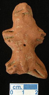 | Description / विवरण | A terracotta archaic male figurine with elongated head, pinched nose, incised lines shows eyes, slit mouth, short out stretched stumpy arms with three incised line in left and two in right, punched navel, short wide bridged stumpy legs with two incised lines in each, the right leg is slightly damaged, phallus indicated in applique, traces of red slip, handmade. |