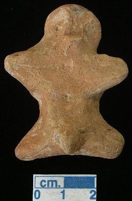 | Description / विवरण | A terracotta archaic male figurine with round head, damaged pinched nose, punched eyes, damaged slit mouth, out stretched stumpy arms, short wide bridged stumpy legs, phallus indicated, dull red, handmade. |