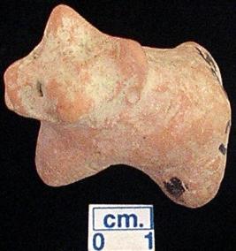 | Description / विवरण | A terracotta animal figurine with hump, out stretched horn with one incised line on each, pin hole eyes, prominent snout, slit open mouth, both hind and fore legs are intact, treated with red wash, handmade. |