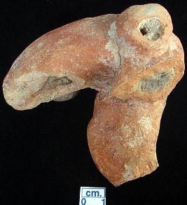 | Description / विवरण | Fragmentory terracotta unidentified object, red in colour, wide vertical hole across on back rounded body, two blade shape hand while one is broken, some flower shape decoration made on lower portion of one blade, handmade. |
