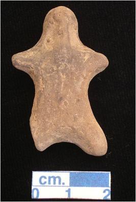 | Description / विवरण | A star shaped terracotta archaic human figurine with small round head, pinched nose, very short out stretched stumpy arms, traces of navel, short wide bridged stumpy legs but right one is partly broken, grey in colour due over firing, handmade. |