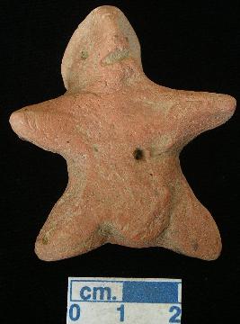 | Description / विवरण | An archaic male terracotta figurine, red, punched nose, pinched eyes, slit open mouth, short out stretched arms and legs, pinhole navel, phallus indicated, handmade. |