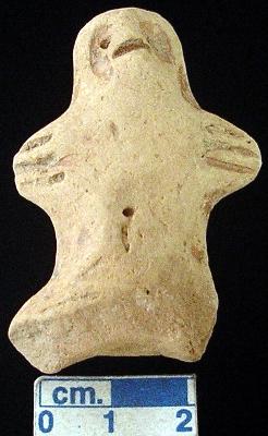 | Description / विवरण | A terracotta archaic human figurine with flat head, red colour, pin hole eyes, pinched nose, slit mouth, short out stretched arms with three incised lines on each, pin hole navel, short wide bridged stumpy legs but left one is broken, traces of red slip, handmade. |