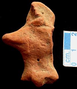 | Description / विवरण | An archaic human terracotta figurine, red, pinched nose, slit mouth, short out stretched arms, shrot wide bridged stumpy leg, punched eyes, punched navel, phallus indicated, handmade. |