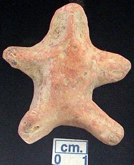 | Description / विवरण | A terracotta archaic human figurine, red, pin hole eyes, pinched nose, slit mouth, short out stretched arms with one incised line in each, punched navel, short wide bridged stumpy legs with one incised line in each, treated with red wash, handmade. |