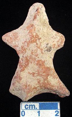 | Description / विवरण | A terracotta archaic human figurine with small head, red colour, pinched nose, short out stretched arms but left one is partly broken, short wide bridged legs but right one is partly broken traces of red wash, handmade. |