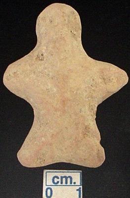 | Description / विवरण | A terracotta archaic human figurine, red, pin hole eyes, pinched nose, slit mouth, short out stretched arms with one incised line in each, punched navel, short wide bridged stumpy legs with one incised line in each, treated with red wash, handmade. |