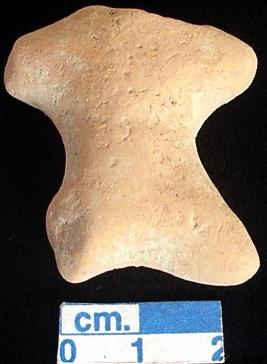 | Description / विवरण | An archaic terracotta human figurine with broken head, red, pinched nose, short out stretched arms, short wide bridged stumpy legs but the right one is damaged, treated with red wash, handmade. |
