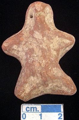 | Description / विवरण | An archaic human terracotta figurine, red, pinched nose, split mouth, short out stretched arms, shrot wide bridged stumpy leg and left leg is broken, punched eyes, punched navel, handmade. |