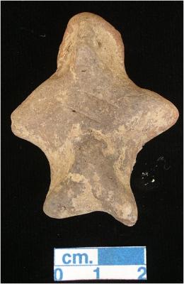 | Description / विवरण | An archaic human terracotta figurine with irregular round head, dull red, pin hole eyes, punched nose and mouth, short out wide stretched arms, short wide bridged stumpy legs, blackish due to over firing, handmade. |