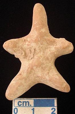 | Description / विवरण | A star shaped terracotta archaic human figurine with elongated long head, dull red colour, short out stretched arms, short wide bridged stumpy legs, treated with red wash, handmade. |