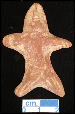 | Description / विवरण | An archaic human terracotta figurine with elongated head, red, pin hole eyes, punched nose and mouth, short out stretched arms with two incised lines in each, short wide bridged stumpy legs with two incised lines in each, treated with red wash, handmade. |