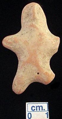 | Description / विवरण | A terracotta human figurine, red colour, pinched nose, slit mouth, short out stretched arms, punched navel, short wide bridged legs but some damaged, punched navel, treated with red wash, handmade. |