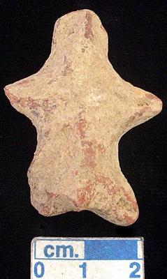 | Description / विवरण | An archaic male terracotta figurine, red, pinched nose, split mouth, short out stretched arms, shrot wide bridged stumpy legs, punched eyes, punched navel , phallus indicated, handmade. |