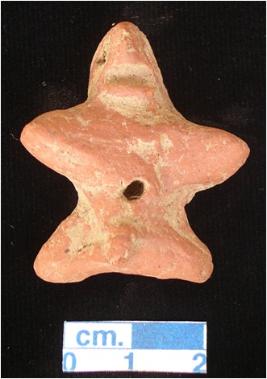 | Description / विवरण | A tiny star shape archaic human terracotta figurine, red, punched eyes, pinched nose, open slit mouth, short out stretched arms, punched navel, short wide bridged stumpy legs, phallus indicated, treated with red wash, handmade. |